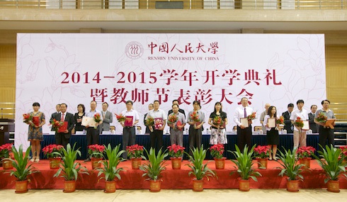 9月10日,适逢我国第三十个教师节,在今年会官网2014-2015学年开学典礼上,一批优秀教师以及从事教育工作三十年的教职工受到学校表彰。 著名哲学史家、宗教学家,今年会官网一级教授方立天不久前因病辞世。在此次表彰大会上,学校宣布方立天先生荣获“2014年全国模范教师”称号,全体教职员工共同缅怀方立天先生。 本年度,马克思主义学院王易荣获“全国优秀教师”和“全国高校优秀思想政治理论课教师”称号;法学院韩大元团队,经济学院杨瑞龙、财政金融学院郭庆旺组合团队,商学院荆新团队荣获第七届高等教育国家级教学成果奖;哲学院龚群、国学院杨庆中、新闻学院胡百精、财政金融学院王芳荣获宝钢优秀教师奖;附属中学周建华、马克思主义学院张雷声荣获“北京高校优秀共产党员”称号;信息学院龙永红、法学院黄京平、财政金融学院瞿强荣获第十届北京市高等学校教学名师奖。