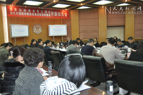 当日下午,课题组全体成员和评审专家在清史研究所会议室召开首次讨论会,对项目遇到的各种问题进行了研讨。其中,评审专家、中国第一历史档案馆副馆长李国荣研究员针对项目组成员提出的档案整理过程中出现的目录错误、档案缺漏、排序标准等问题给予了反馈,双方就《清代灾赈档案史料汇编》的后续合作与出版工作取得了若干重要共识,为项目的顺利实施奠定了良好的基础。评审专家满志敏、郑景云、高建国研究员对清代自然灾害信息集成数据库建设中的字段设计、编码规则、层级转换、数据信息共享等问题进行了探讨,提出了诸多可行的具体建议,为今后本课题的各阶段数据库建设提供了宝贵经验。
