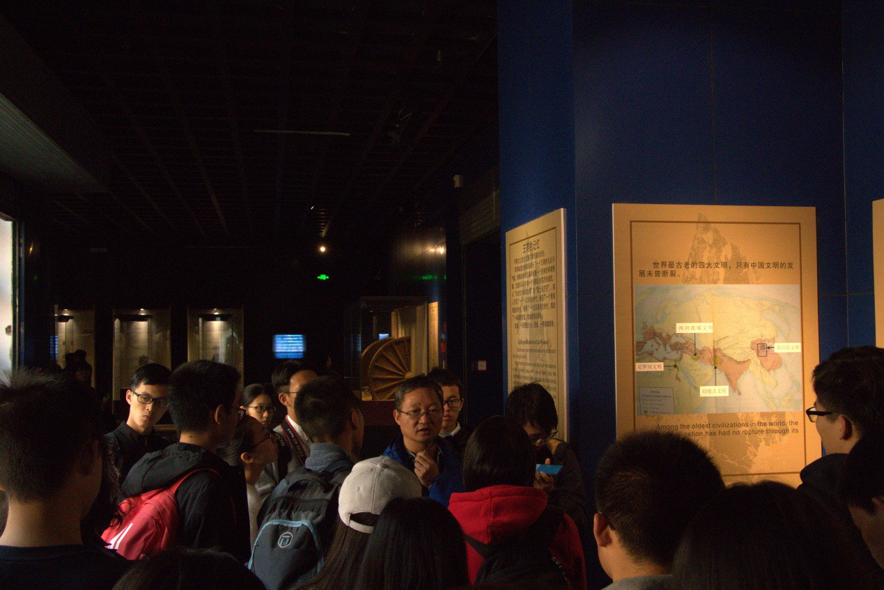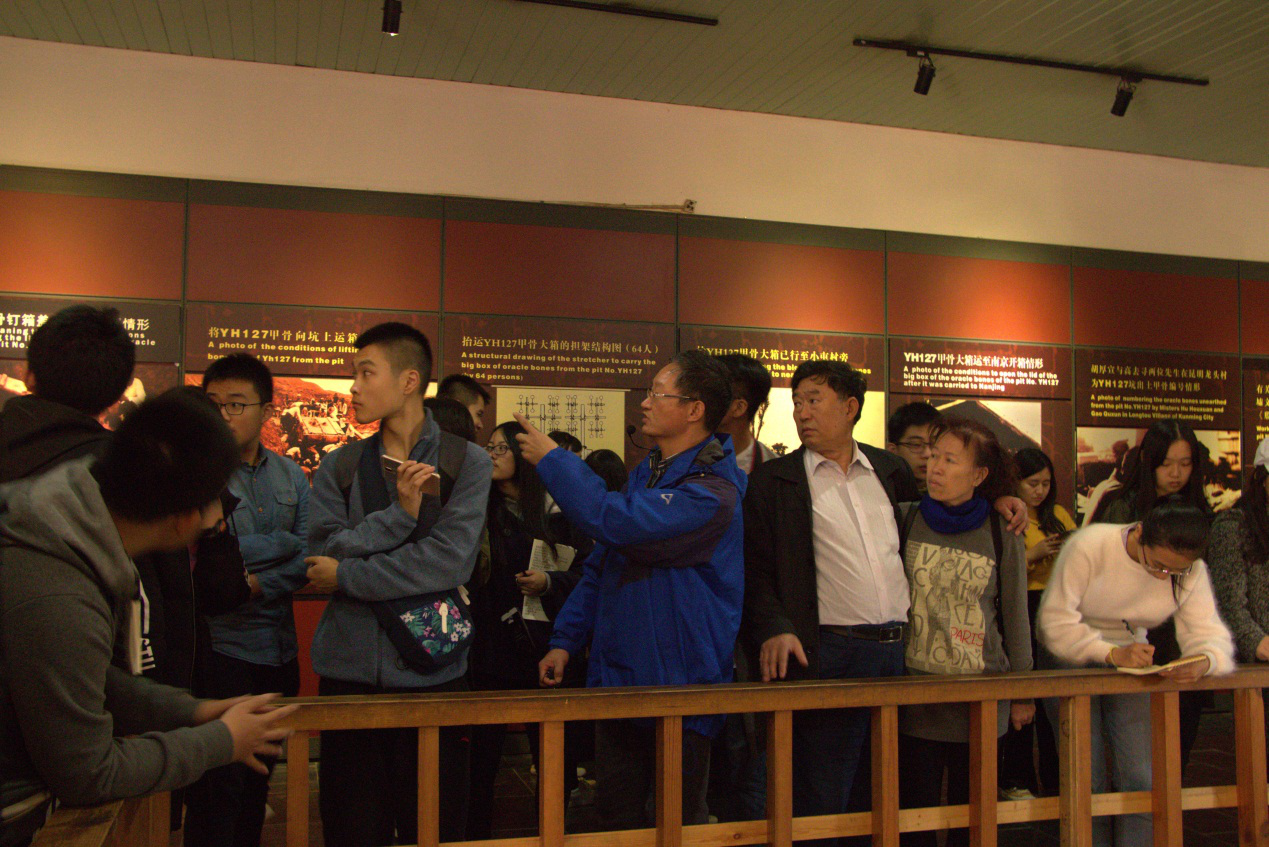 在博物馆前,王鼎同学根据事先准备材料,为大家简单介绍殷墟发掘背景及意义。随后,在岳洪彬老师带的带领下,同学们进入博物馆展厅。穿过“回字形”历史走廊,进入“商代”地面,一方池水,隐约可见有一片黑色龟甲,以甲骨文书体铭刻着“日在林中初入暮,风来水上自成文”诗句,暗喻安阳殷墟洹河河畔是汉字的发源地。