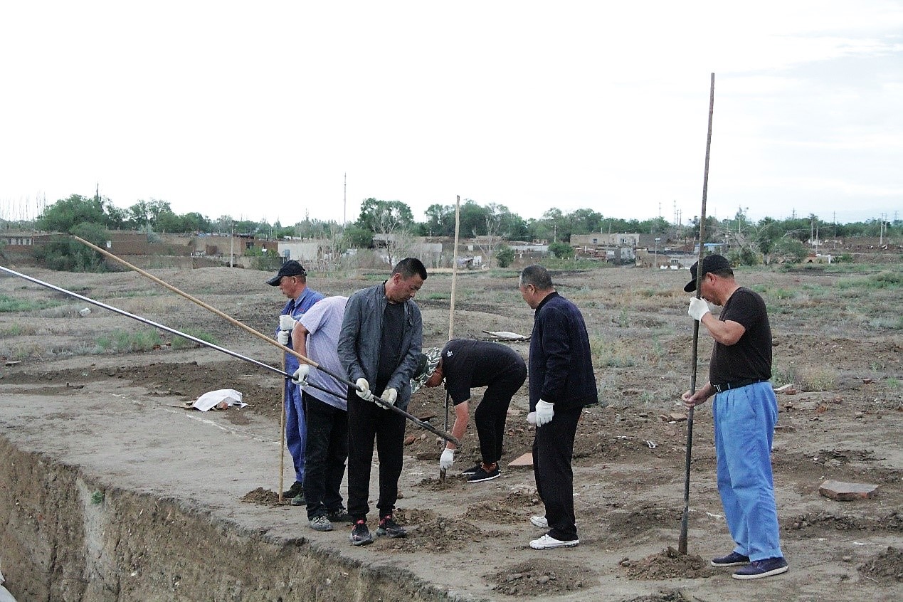 24日晚,第二批考古队成员硕士生9人抵达奇台县驻地。25日清晨,在召开了发掘工作准备会之后,全体成员前往工地开展布方工作,2019年唐朝墩古城遗址考古发掘正式拉开序幕。