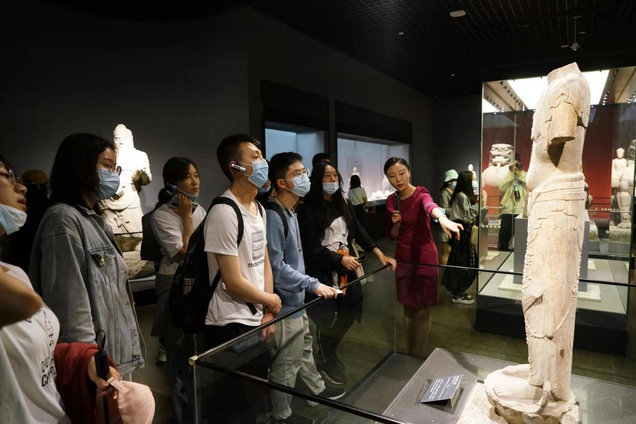 随后,师生一行简单参观了“曲阳石雕”、“名窑名瓷”、“北朝壁画”三个展厅。“曲阳石雕”展厅展示了从汉代到元代的曲阳石雕精品132件,其中大部分为佛教造像,造型精美。“名窑名瓷”展厅展出瓷器精品276件,这些瓷器时代跨度大、釉色丰富、造型各异、地方特色浓郁,具有极高的历史研究价值和艺术欣赏价值。“北朝壁画”展厅展示了一批北朝皇室墓葬出土的壁画、陶俑的原件或复印件,其中最壮观的是按原件绘制的北齐文宣帝高洋墓墓道临摹壁画,表现了53人组成的仪仗队列护送引导墓主人升天成仙的出行场景,奇幻瑰丽,同学们不禁连连称叹。参观完河北博物院后,师生一行乘坐大巴前往正定。
