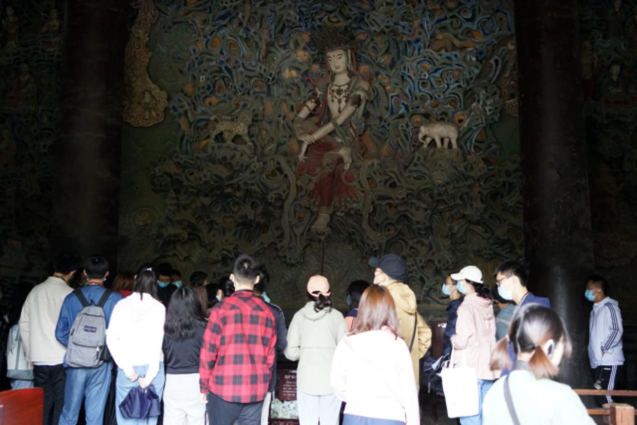 随后,师生一行来到摩尼殿。徐怡涛教授讲到,摩尼殿是重檐歇山顶,面阔和进深均为七间,殿身四面正中各出一山花向前的歇山式抱厦,檐下斗拱宏大,中国古代建筑和礼制、政治都是密切相关的。进入开阔的摩尼殿,正中间是泥塑金身的释迦摩尼佛像,殿内还有精美的壁画,使用沥粉贴金的工艺,色彩艳丽。李明老师为同学们讲解了壁画的内容及壁画的创作等方面的知识。摩尼殿里有一座著名的五彩悬山。李老师指出,五彩悬山是以雕塑与绘画相结合的壁塑艺术,踞坐正中的观音菩萨突破了宗教偶像的呆板作风,形体曲线柔美,姿态优雅端庄。她提醒同学们注意这尊观音的方向,因其坐南面北,与大殿坐向相背,又被称作“倒坐观音”。徐老师补充讲解了塑像的修缮中有不同的价值取向,同学们现在看到的悬山的外观颜色是在宋代基础上历代修缮的结果,代表民间的愿望,因为信众希望看到颜色鲜艳的塑像,而文物界认为应该修旧如旧。