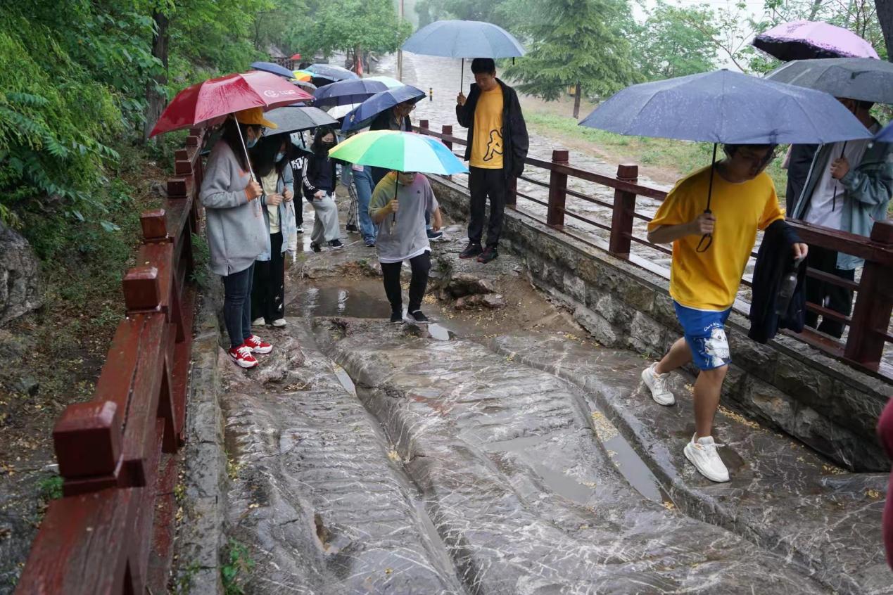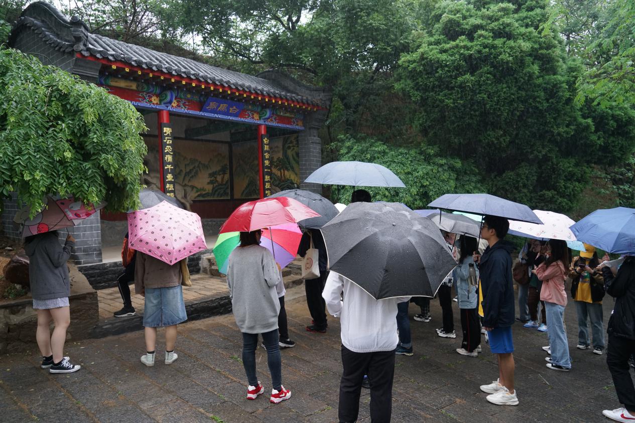 在讲解员蒋老师的带领下,师生一行迎着斜风细雨踏上蜿蜒的井陉古道,道路越走越陡峭。蒋老师讲到,同学们现在行走的古道已经经过修复,平坦许多了。目前古道最高的坡度是45度。行至古道中间,白马告状庙映入师生眼帘。蒋老师讲到,清朝的时候,一位商人用白马拉车过这个东天门关隘时,白马被推车汉陷害致死,后来相关推车汉都得怪病而死,乡民在此建庙纪念。姜萌老师告诉同学们,从真实性、科学性的角度来看,白马告状的故事可信度不高。但是这个故事却反映了伦理观念在中国古代社会是如何传播的,也反映了因果报应等民间信仰,以及明清时期此地的一些商业运作和居民生活等情况。