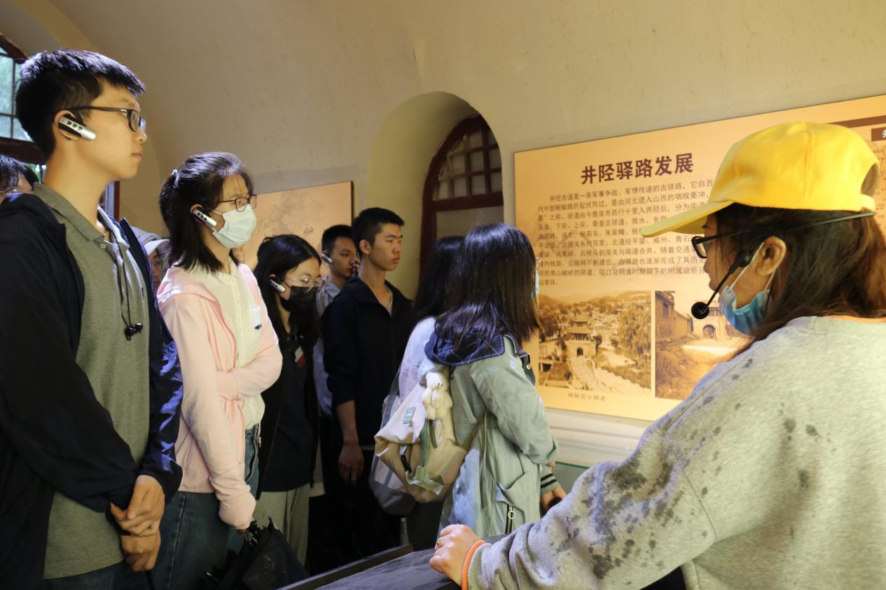 随后,师生一行来到立鄙守路驿铺。蒋老师讲到,立鄙守路驿铺是我国现存最完整的古驿铺,被称为我国邮驿发展史上的活化石,是古代官员过往休息,邮差补充给养、转送函件以及看守维护道路的场所。在井陉古驿博物馆内,蒋老师给同学们讲了井陉古道的历史。井陉古道是秦驰道的一段,其历史可以追溯到西周时,已经有两千多年的历史了,地势四周高中间低。井陉位处冀晋交界,历为兵家重地,在古道上演绎了多少惊心动魄的历史事变,韩信的背水之战的主战场就在井陉。