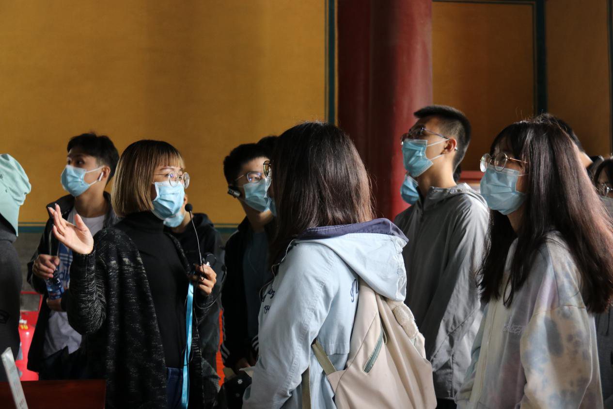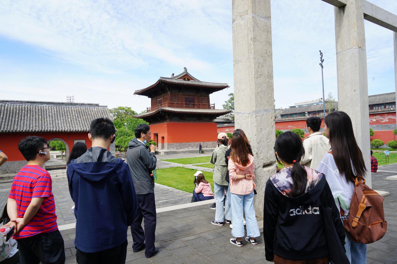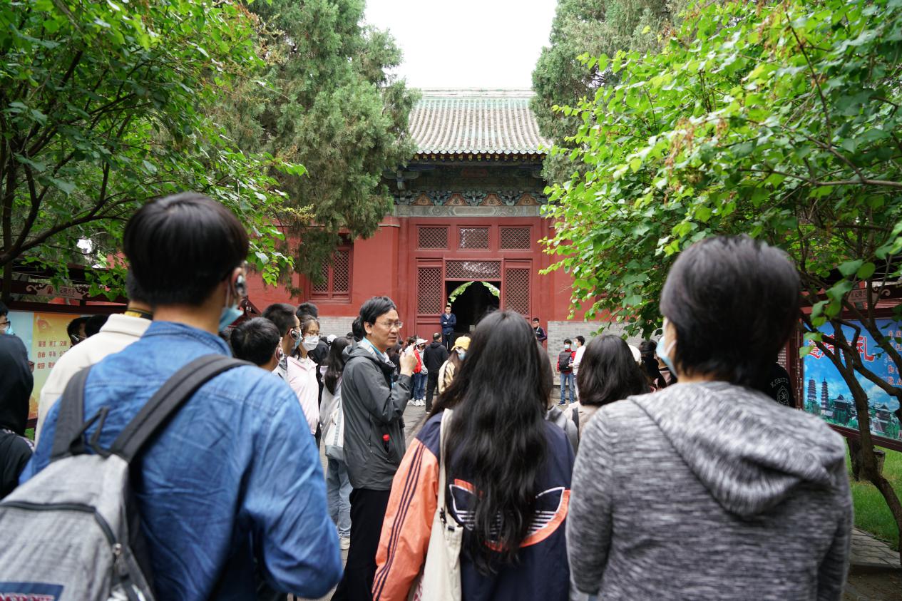 在天王殿外,徐怡涛教授为同学们讲到,中国古代建筑有等级制度,刚进门的天王殿是单檐歇山顶的形式,在古代建筑等级中是第二级。天王殿是北宋时期的,但是清代重修了,屋檐上的小斗拱是清代后加的。明清时期斗拱明显变小,而唐宋时斗拱的高度很高,在这个建筑上能明显看到两个时代斗拱的区别。古人重修古建筑时会按照当时的审美修建建筑,所以会形成很多的历代层叠,而现在的古建修复原则是尽量复原当时的建筑原貌。