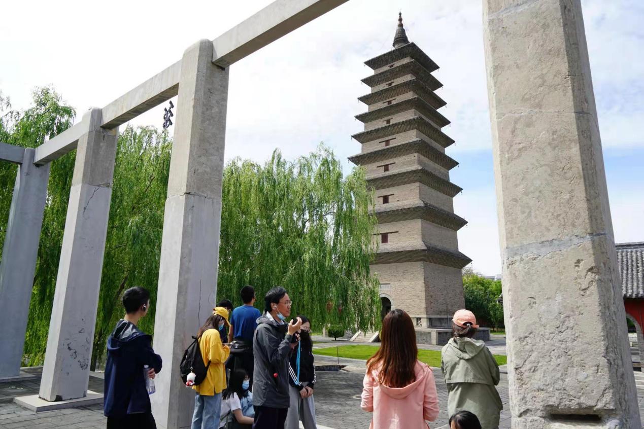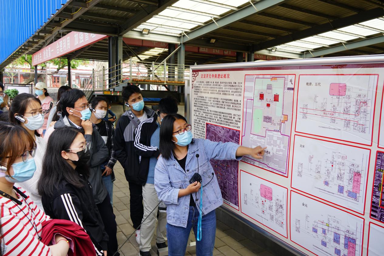 随后,师生一行来到开元寺南广场遗址考古工地。佘俊英老师向同学们简单介绍了南广场遗址的开发情况。开元寺南广场遗址发现了唐、五代、北宋、金、元、明、清七个历史时期连续的文化层叠压,发现遗迹现象200余处,出土遗物6000余件,完整地展现了正定古城悠久的历史文化脉络。