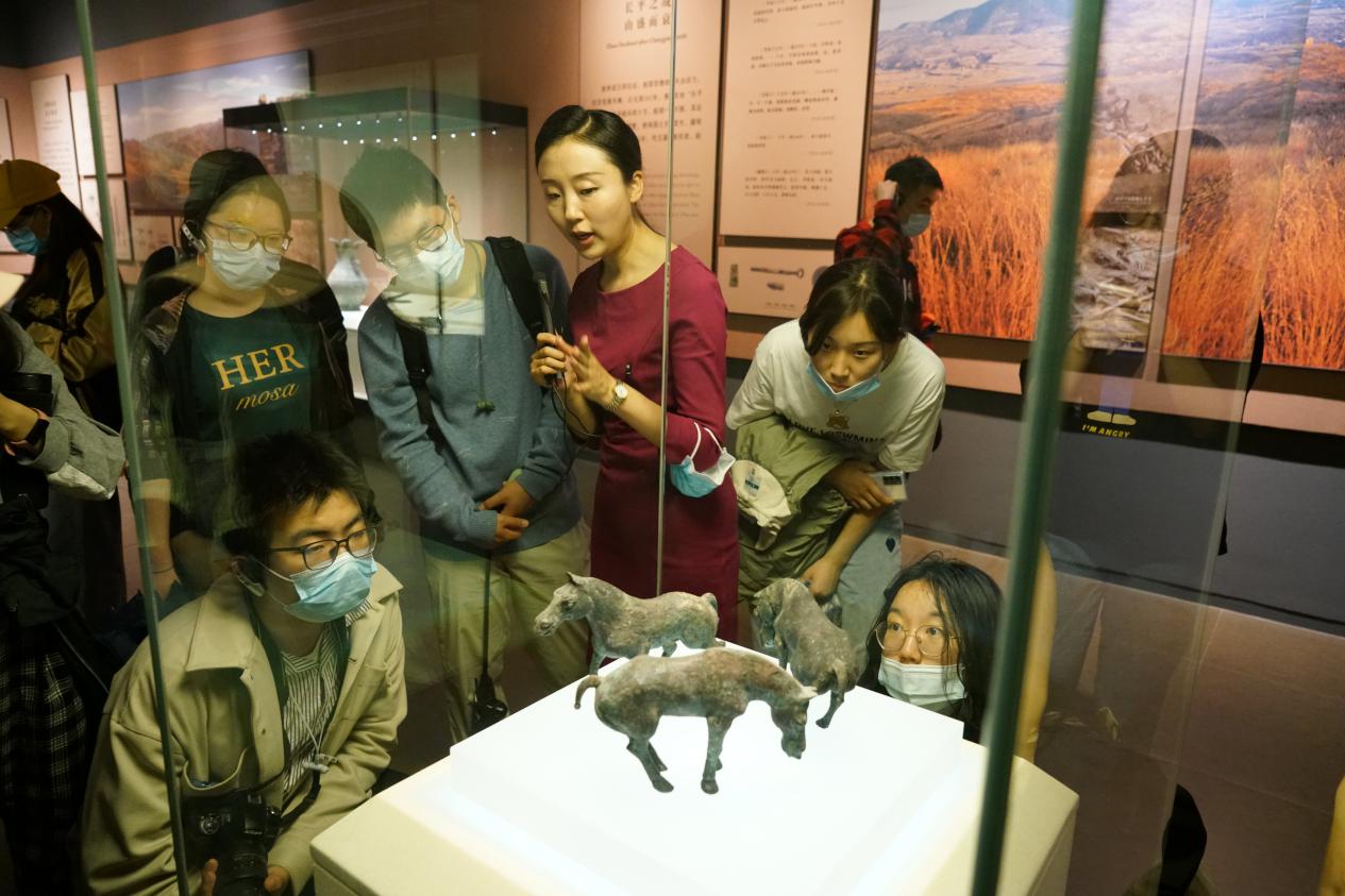 在“慷慨悲歌——燕国故事”展厅,首先映入同学们眼帘的便是燕下都时期各式各样、花纹各异的半圆形瓦当,有卷云饕餮纹、草叶卷云纹、山云纹、山形饕餮纹、双鸟纹等等。接着,虎头形陶水道管口吸引了同学们的目光。陶水管是虎头形,老虎张口瞪目,双耳后翘,两只前足平伸,四爪着力,巧妙地利用老虎大张的嘴巴起排水作用,同时又将实用与艺术造型融为一体,构思巧妙。进入“慷慨悲歌——赵国故事”部分后,同学们看到了运用多媒体手段演示的“胡服骑射”、“完璧归赵”等历史故事,以及展出的赵国墓葬出土的铜器、玉器和陶器等。其中赵王陵2号陵园出土的铜马吸引师生一行的目光。贾老师提醒同学们认真观察三匹铜马的形态,有的在静立,有的在低头觅食,把马的动态和静态展示的活灵活现,表现了赵国多姿多彩的历史文化。
