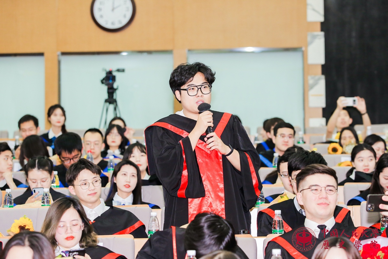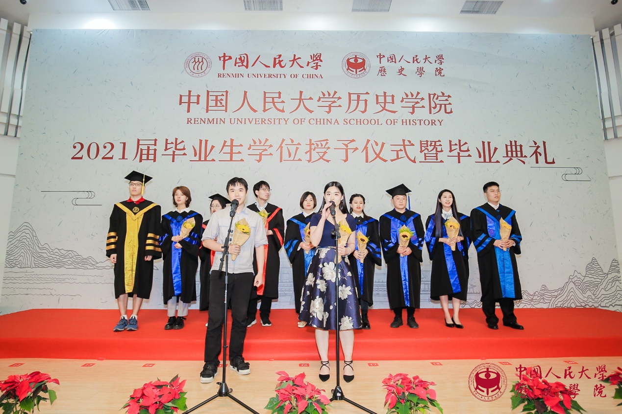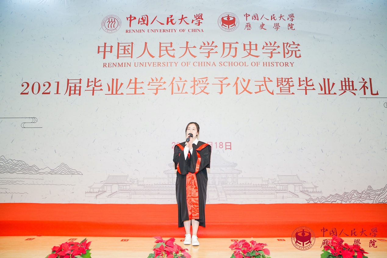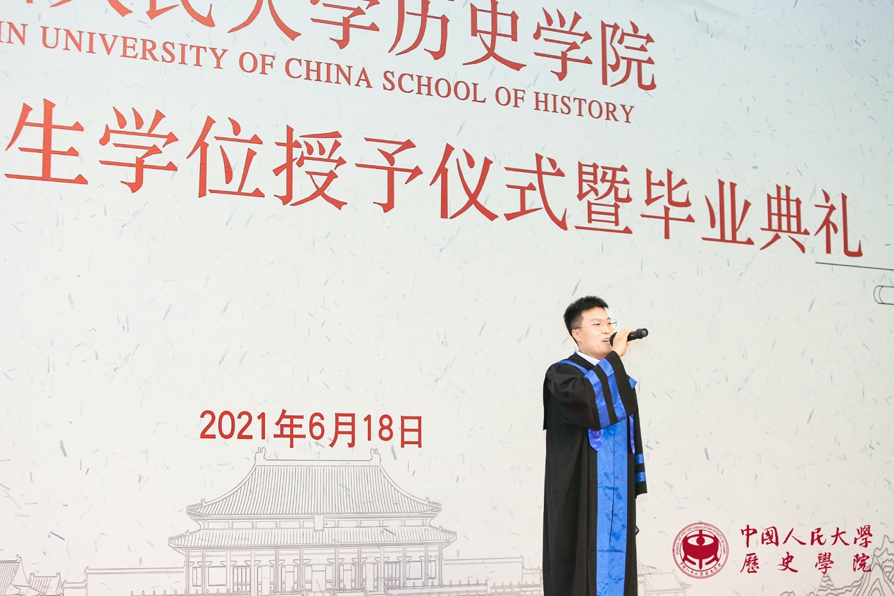 接下来是代表发言环节。魏镇同学代表2021届博士毕业生发言。他感慨不知不觉中在人大已度过十年光阴,从懵懂求学到学有所成、收获满满,这些将成为伴随自己一生的珍贵财富;理性与感性复杂交织的历史研究训练,带给自己求真精神、严谨态度和宏大眼光,这些都是史学赋予学子流淌在血液中无法割裂的永恒“延续”。曾嘉慧同学代表2021届硕士毕业生发言。她通过自己每天的卡片式记录,回顾了自己在人大生活和学习的历程,发现它也就是对书籍、知识和文献不断研习与探索的过程,亦可见自己不断进步、日渐成熟的心路。她感谢老师的鼓励和同学的支持,使她得以克服困难,始终坚持下来,最终获得进学东京大学攻读博士学位的资格。张雨晨同学代表2021届本科毕业生发言。他分享了自己关于职业方向选择、工作地域选择以及对升学和就业的具体安排等,并衷心祝愿同学们能够把握时代机遇,实现人生价值。