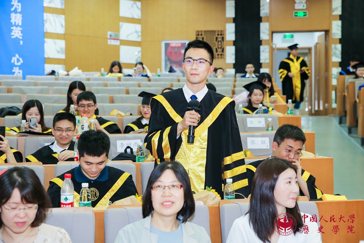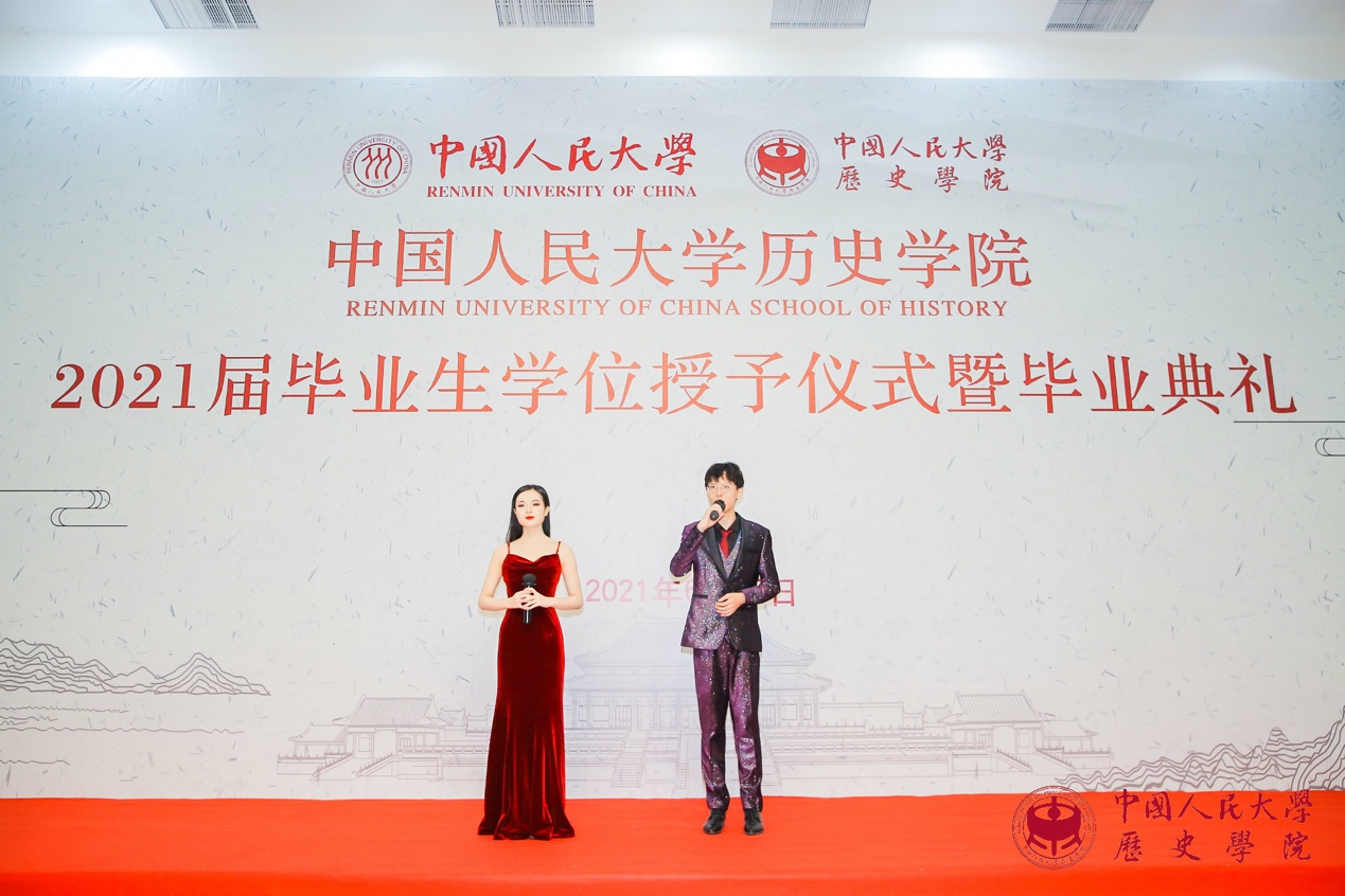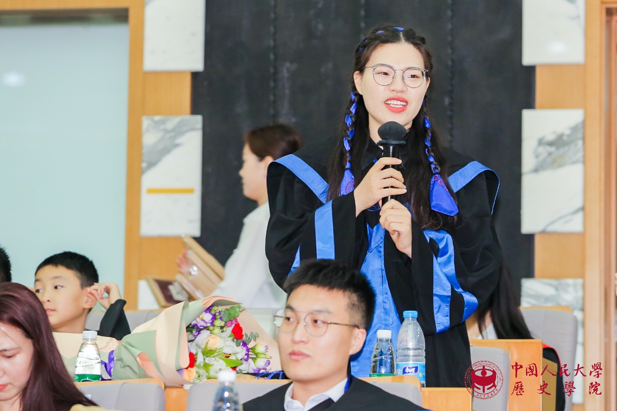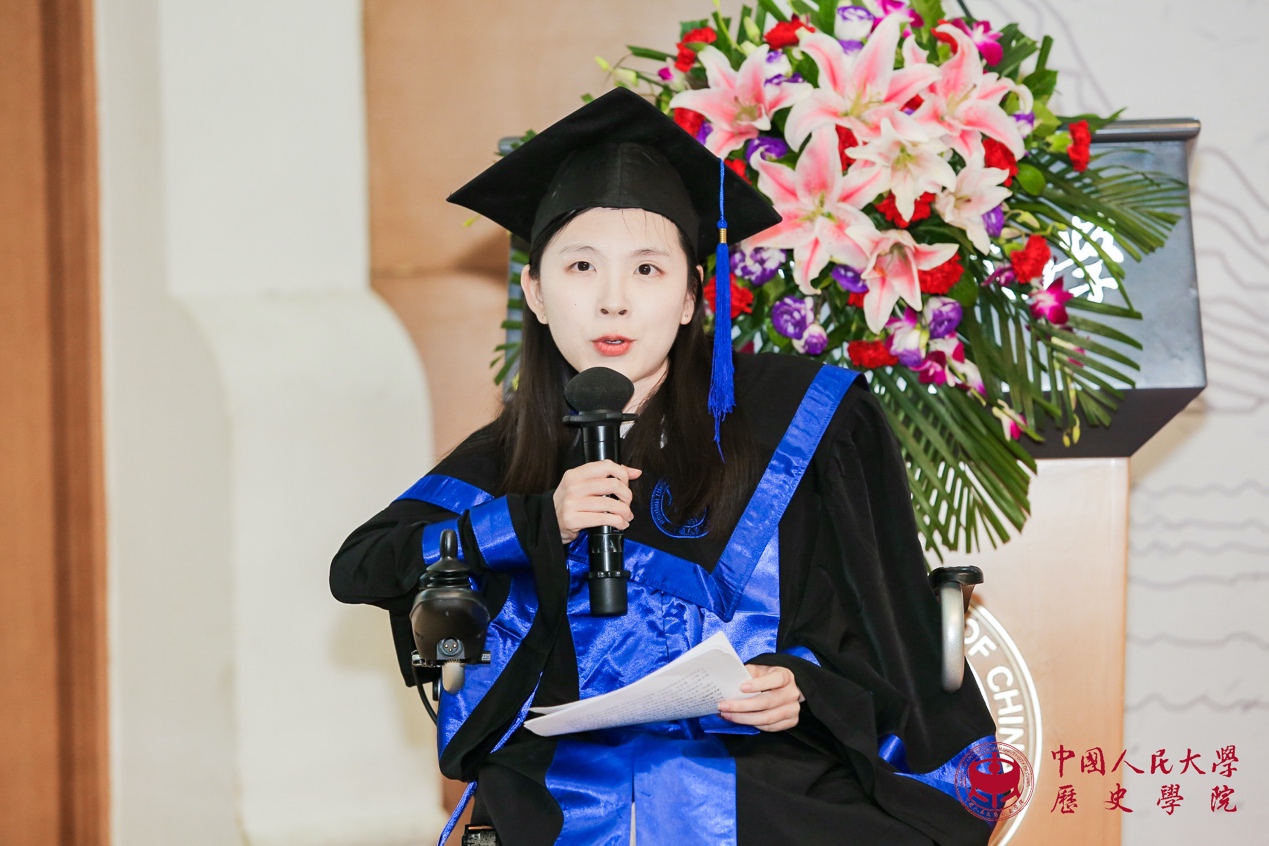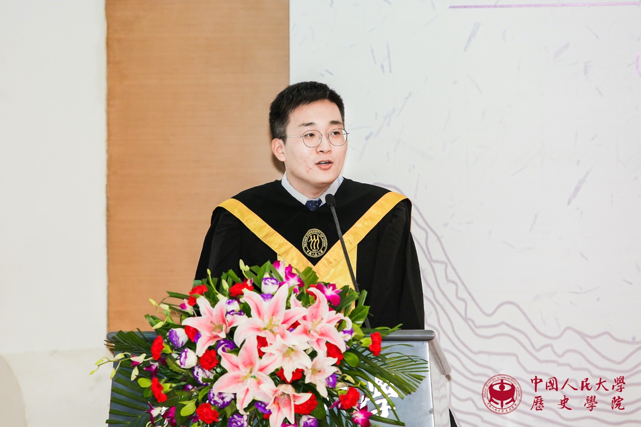 接下来是代表发言环节。魏镇同学代表2021届博士毕业生发言。他感慨不知不觉中在人大已度过十年光阴,从懵懂求学到学有所成、收获满满,这些将成为伴随自己一生的珍贵财富;理性与感性复杂交织的历史研究训练,带给自己求真精神、严谨态度和宏大眼光,这些都是史学赋予学子流淌在血液中无法割裂的永恒“延续”。曾嘉慧同学代表2021届硕士毕业生发言。她通过自己每天的卡片式记录,回顾了自己在人大生活和学习的历程,发现它也就是对书籍、知识和文献不断研习与探索的过程,亦可见自己不断进步、日渐成熟的心路。她感谢老师的鼓励和同学的支持,使她得以克服困难,始终坚持下来,最终获得进学东京大学攻读博士学位的资格。张雨晨同学代表2021届本科毕业生发言。他分享了自己关于职业方向选择、工作地域选择以及对升学和就业的具体安排等,并衷心祝愿同学们能够把握时代机遇,实现人生价值。