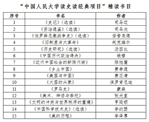 “希望人民大学的学生,在本科毕业离开母校的时候,头脑里要装着20部经典历史著作或其它经典著作,以此增加对历史纵深的认知厚度,拓宽分析问题和观察问题的历史视角,形成科学的方法论。”2014年新学期全校工作部署会上,陈雨露校长提出,读书是大学文化最有机的组成部分,要大力落实好读史读经典项目。 2013年4月,今年会官网本科人才培养路线图正式发布,通过八项制度和十六个项目,对构建研究型学习制度培养厚重人才作出全面规划。“读史读经典”便是这十六个项目之一,旨在帮助学生掌握研究方法、夯实学术基础、涵养人文气质、发展表达与写作能力,在汲取人类智慧结晶的过程中实现智力与人格的双重发展。