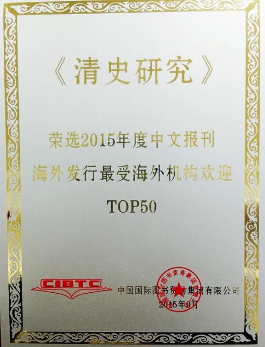 2015年9月18日,在第三届中国(武汉)期刊交易博览会上,以“融合、创新、发展”为主题的中国报刊发行高峰论坛隆重举行。作为承办方,中国国际图书贸易集团有限公司再次对中文期刊海外发行情况进行了梳理,并面向全球发布了“2015年度中文期刊最受海外机构欢迎50强”榜单,《清史研究》成功入选,这是继2013年入选该机构评选的“最受海外机构用户青睐的中国期刊海外发行排行”50强之后的再次入选(报道见http://qsyj.iqh.net.cn/CN/column/item118.shtml)。在迄今为止发布的两次榜单中,《清史研究》均名列其中。该份榜单是中国国际图书贸易集团有限公司根据此前十年的发行数据统计、整理出来的,已以其权威性、科学性,受到了中外业界的高度关注。