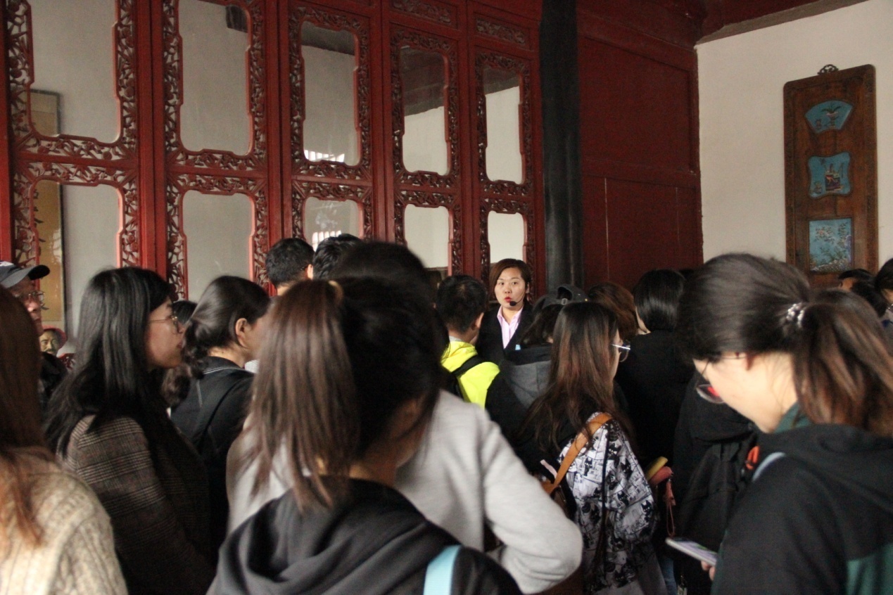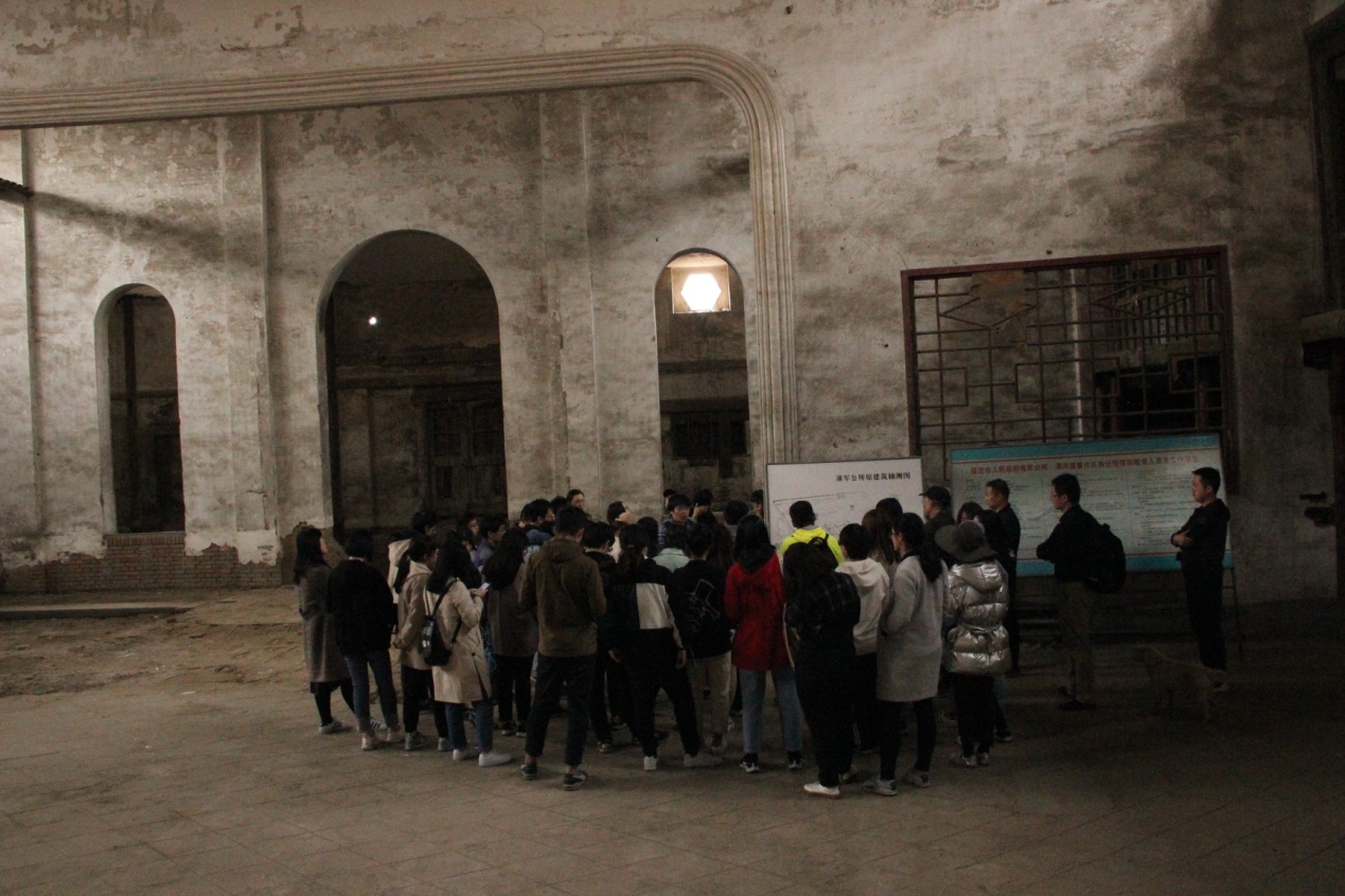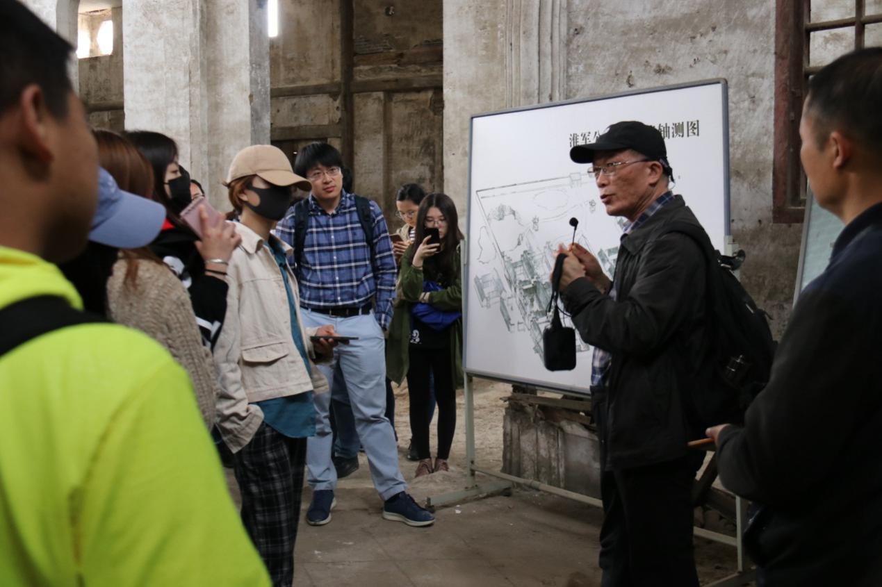 保定考查的第三站是淮军公所,其全称为“淮军昭忠祠暨公所”,是李鸿章为纪念在镇压太平天国和捻军中阵亡的淮军“将士”而建的昭忠祠,李鸿章去世后,又改建为“敕建李文忠公祠”。管理处韩老师介绍道,淮军公所建筑风格南北兼容,别具一格,规模宏大。现存的迎宾院、戏楼、昭忠祠等为徽式建筑,后部院落则是北方四合院形制,两种风格形成鲜明对照,既包含着北方建筑的古朴浑厚,又体现着南方建筑的精巧秀美。更加令师生叹为观止的是巧夺天工的建筑雕刻。步入祭场,放眼细看,木质结构的梁柱、檐枋、柱额,甚至马鞍形椽架,都装饰着花鸟、走兽等雕刻,形态各异,栩栩如生,戏楼更是雕梁画栋,精美有加。在“淮军公所原建筑轴测图”前,姜涛老师简要为同学们梳理了淮军发展的历史及其在清末的作用和影响,并建议感兴趣的同学阅读王尔敏先生撰写的《淮军志》等研究成果。