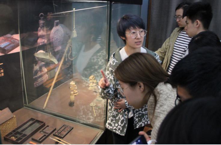 同学们在讲解员指引下观察账房工具