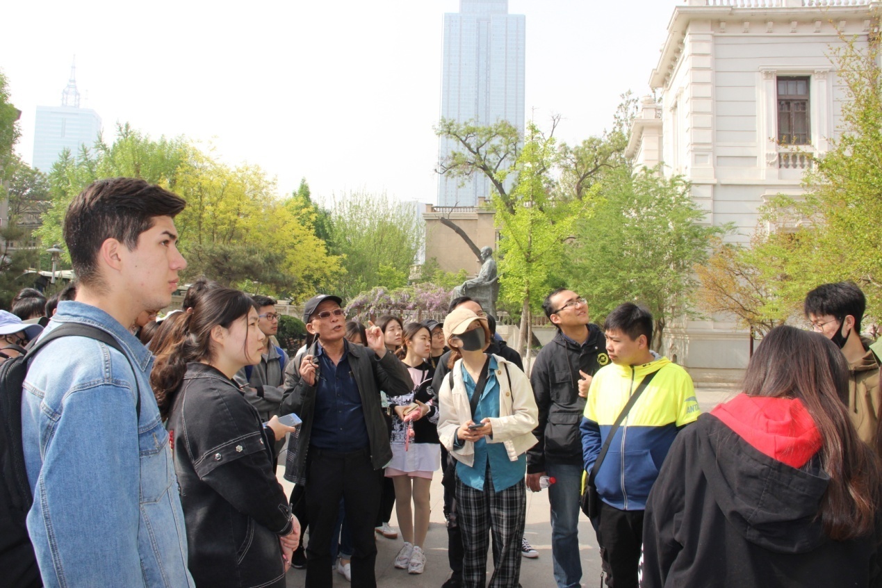 第二天一早,师生一行先步行到天津海河上的解放桥。姜萌老师和马克锋老师为同学们介绍了解放桥的建造目的、名称来源和建筑特点。随后同学们沿海河而上,隔岸观看了原英租界工部局大楼等建筑,然后步行前往意大利租界,经马可波罗广场到达梁启超故居。在排队等候时,马克锋老师为同学们介绍了梁启超在天津修建晚年住所的原因。进入故居后,马老师又指出,梁启超乃当之无愧的百科全书式学者。以往学者们对其学术思想关注较多,事实上他的经济思想、经济活动亦颇为丰富,但至今相关研究较少。马克锋老师鼓励同学多多阅读梁启超书信等一手史料,“有趣”地发现问题。