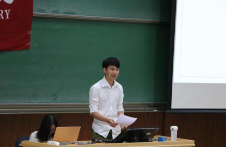 2016级本科生王铭梓作为老生代表发言。他以“尝试-选择-责任”为脉络,串联起自己的大学生活,并与新同学分享了他在学习、社团、生活中的历练与成长体会。最后,王铭梓同学将梁启超先生的“今日之责任,不在他人,而全在我少年”作为寄语赠给各位新生同学,期望他们胸怀家国天下、坚守学术理想,不负“国民表率、社会栋梁”的期许。