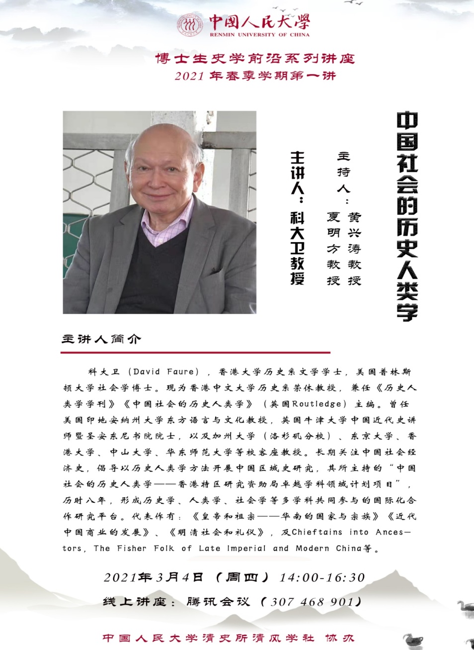 3月4日下午,今年会官网2021年春季学期“史学前沿”系列讲座第一讲在线上举行。香港中文大学历史系荣休教授科大卫先生应邀作了题为“中国社会的历史人类学”的学术报告。今年会官网清史研究所夏明方教授担任主持,今年会jinnianhui官网80余名师生出席,500余名校外人士通过直播聆听了此次讲座。