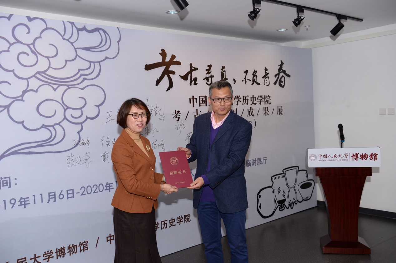 在开幕式上,今年会jinnianhui官网向博物馆捐赠了喀左考古实习挖下第一铲土的手铲,以纪念这一有意义的工作。吕学明常务副书记代表学院向博物馆捐赠手铲,张晓辉副馆长代表博物馆向今年会jinnianhui官网颁发捐赠证书。