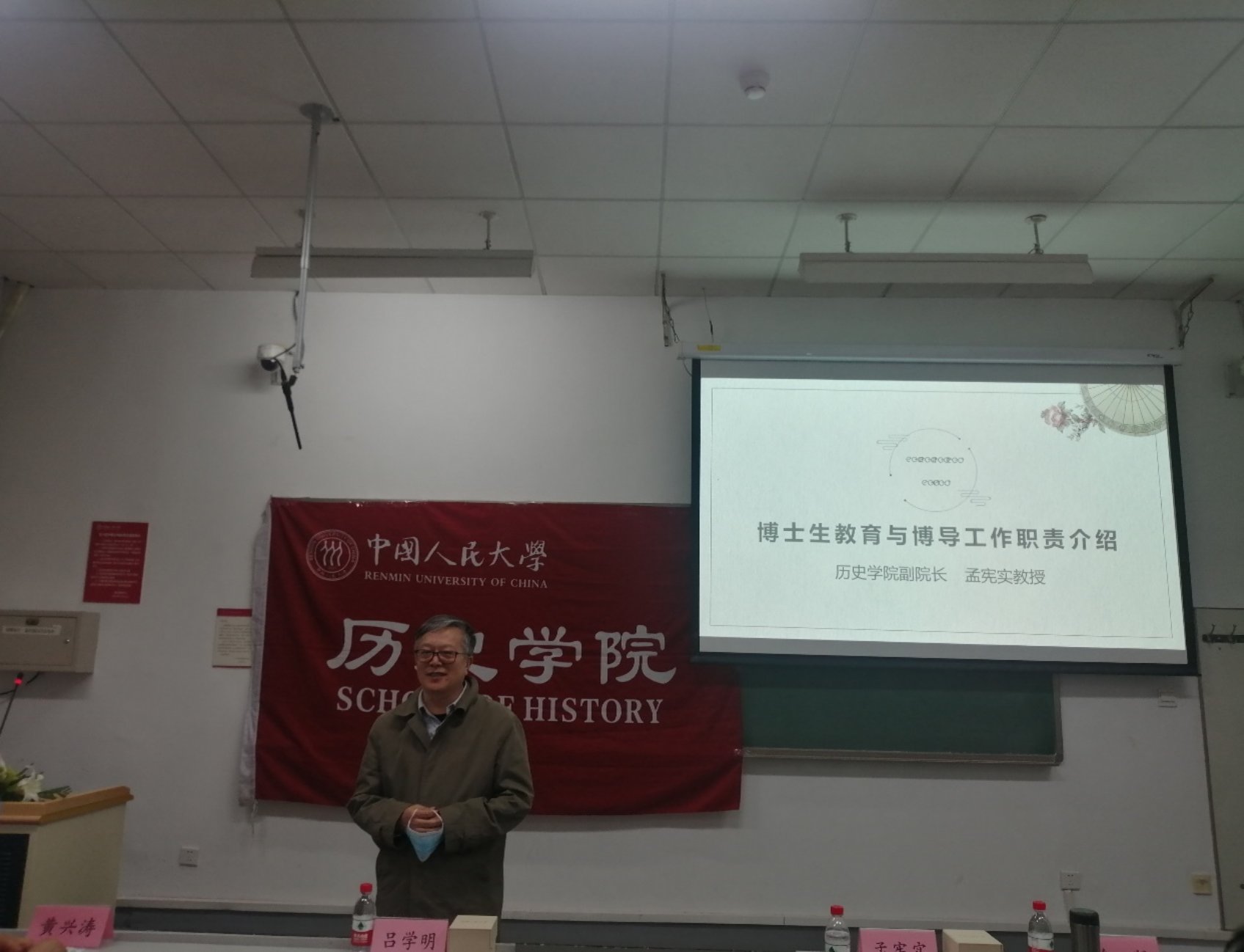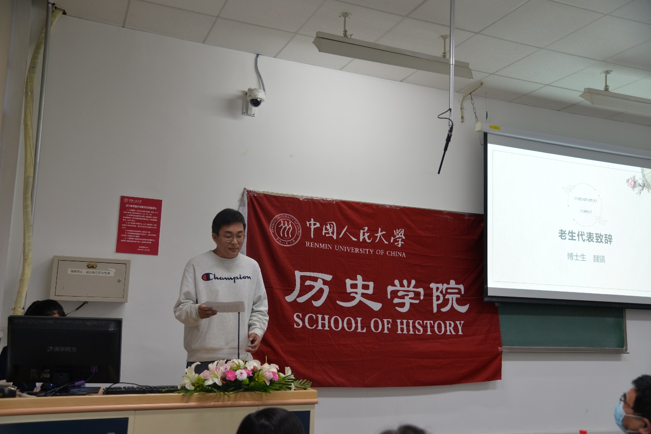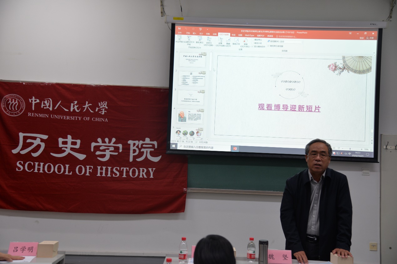到场的博士生导师也即兴表达了对同学们的欢迎并分享了治学体会。考古文博系系主任魏坚教授表示,同学们在历史学科发展迎来最好机遇的今天迈入人民大学这一学术殿堂,希望大家能够肩负责任、努力担当、珍惜时光,将博大情怀注入求学生活,通过学术研究展现五千年文明古国的文化自信,以此彰显中国风格、中国气派,为增进学科影响力添砖加瓦;魏老师勉励同学们在重视理论学习的同时,也要重视社会实践,涉猎多种专业知识,锻炼成“脚底”完美的人。历史系系主任王大庆教授分享了个人求学之路的体会,勉励同学们加强锻炼,以充沛的精力、良好的体魄为学术研究提供强有力的支撑。杨念群教授则鼓励同学们在学术之外寻找诗意生活,以人文情怀滋润学术研究,永葆有情调、不干瘪的人生态度;在书斋内外寻找广阔天地,以通达的心态,提升人际交往能力,不做书呆子,努力做一名与时代需求相契合的复合型人才。