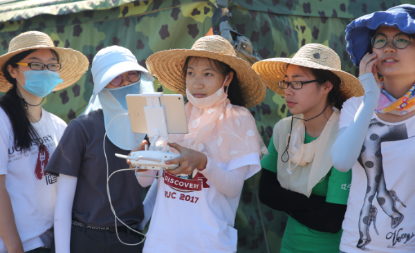 (同学们正在专心致志地学习航拍飞机的操纵)
