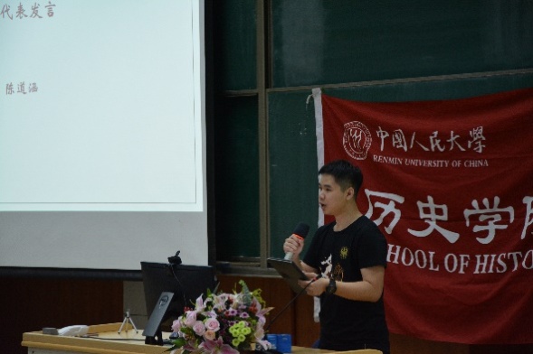 在校生代表陈道涵发言,作为史院大家庭的一名老生,陈道涵以“此心安处是吾乡”一句诗为主题,从“与陌生和解,与自由同行”、“求真求实,探索新知”、“肩负时代使命,胸怀远大理想”三个方面向新生们分享了史院何以为乡。本科新生代表轩望帆发言,他围绕“为什么要学习历史”这个问题,从历史学的用处、学习历史的目的和个人热爱的角度给出了自己的回答。