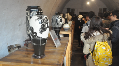 (同学们认真观摩陶瓷工艺成品)