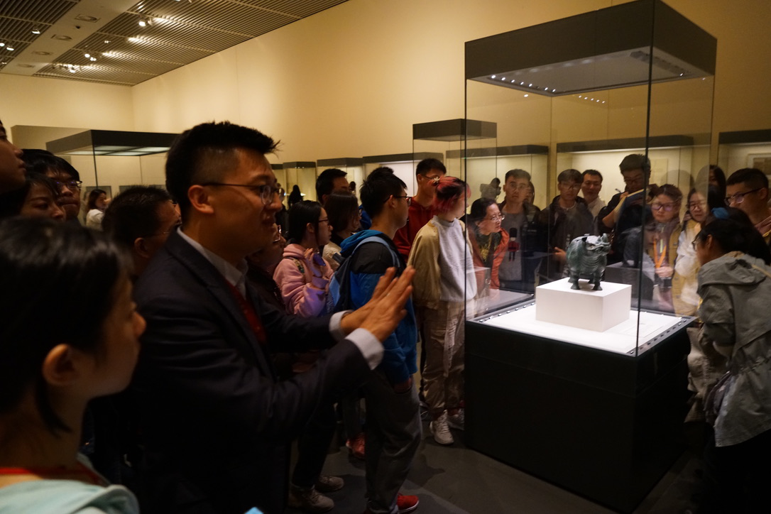 (张老师为同学们介绍错金银云纹青铜犀尊)