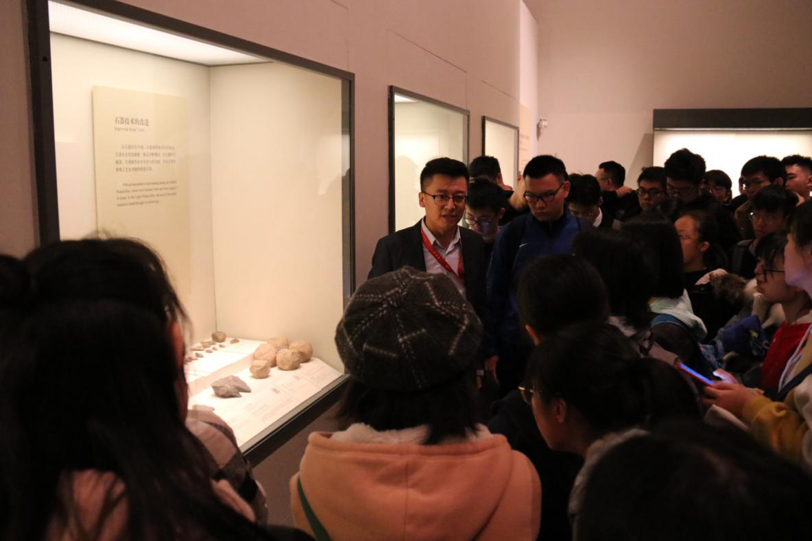 “古代中国”是中国国家博物馆的基本陈列,它以王朝更替为主要脉络,分为远古时期、夏商西周时期、春秋战国时期、秦汉时期、三国两晋南北朝时期、隋唐五代时期、辽宋夏金元时期和明清时期八个部分。张鹏老师讲到,“古代中国陈列”展览反映了中国社会的发展史,展览较为全面地展示了古代中国不同历史时期政治、经济、文化、社会生活以及中外交流等方面的发展状况。展览内容十分丰富,由于时间有限,此次同学们的参观学习主要集中在远古时期、夏商西周时期、春秋战国时期、秦汉时期四个部分。