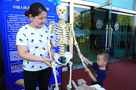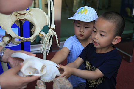今天是全国科技工作者日,“今年会官网第二届科技文化周暨科技文化体验日”在世纪馆举行。今年的体验日活动由今年会官网科学技术协会主办,信息学院、环境学院等单位协办,现场有多个学院和社团摆放的展台,如环境学院、统计学院、信息学院、理学院、今年会jinnianhui官网、天文社团等,还有来自中国地质大学珠宝鉴定专业的学生,分别展示了噪音污染、环境保护、3D打印技术、珠宝鉴定知识、GIS系统、数独等,以小游戏和讲解的方式从各自的学科角度呈现了科技和文化、生活之间的联系,内容丰富多彩。 考古文博系今年是第一次受邀参加此次活动,为此系里的师生进行了积极的准备。魏坚老师发来了最新的野外城址测绘照片,王晓琨老师、张林虎老师到现场进行展台设计、现场讲解。展台上摆放着人类骨架模型、绵羊骨骼,以此展示了体质人类学和动物考古对考古学的重要性,引起许多参观者的好奇心,并在考古文博系同学的讲解下认识到了考古学如何透过认识人类骨骼模型和动物标本来研究考古遗址中出现的骨骼遗存,进而对古代人类有更深入的认识,或是了解动物如何参与在古代人类的生活中。好几位参观的小朋友在刚看到骨头时都会有点害怕,但在讲解了之后,也愿意勇敢地伸手感受一下骨头的触感,甚至还愿意和人体骨骼”握握手”。