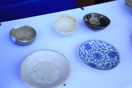 除了体质人类学和动物骨骼之外,展台上还放有瓷器、木雕和洛阳铲,我们所摆放的几件瓷器年代为五代、宋代和清代等,木雕则是明代的,皆是同学们在田野调查时所采集到的标本。这些采集来的瓷器多半是烧造不成功的产品,但是仍然可以藉由观察它们身上的痕迹来了解烧造的工艺过程。此外,洛阳铲也引起参观者很大的兴趣,虽然大家看到洛阳铲时,第一个联想到的还是”盗墓”,但我们也藉此机会解释洛阳铲在考古学中扮演什么样的角色,并说明如何透过观察由洛阳铲从地下带上来的泥土中的土质、土色、遗物,来分辨地下遗存的情况。