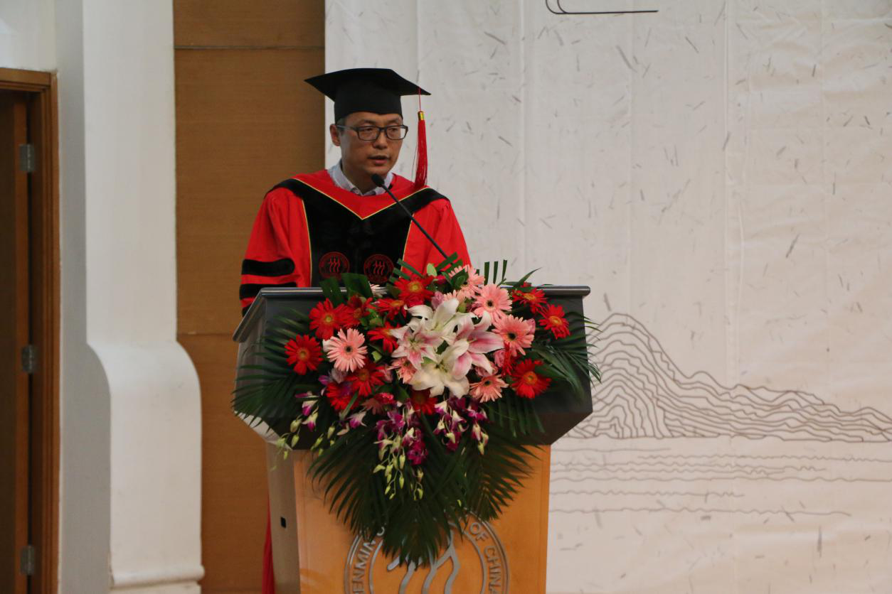 最后,黄兴涛院长为毕业生致辞。他首先祝贺同学们获得学位,并已站在一个新的历史高度,即将由一个新的起点,开始新的人生途程。接着,他从一种特定时空认知事物与定位思想的自觉习惯、一种重视过程的连续性意识、一种对于历史与现实关系的高度敏感,以及透视社会人事的多维整体之“通”观等多个方面,谈到自己对“历史感”的理解。黄老师强调,历史感是一种纵深感、一种世事无常的命运意识、一种连续性自觉和长时段关切,真正拥有历史感的人绝不会满足于简单地就事论事,绝不会计较一时一事的得失。没有真正的历史感,也不会有彻底的达观,而要养成深刻的历史感,除了丰富的历史知识的积淀之外,还需要持续扩大知识视野、不断涵育人文关怀。他希望毕业生们踏入社会后,要始终保持和培育这种“历史感”,要让一种深刻的“历史感”伴随终生。