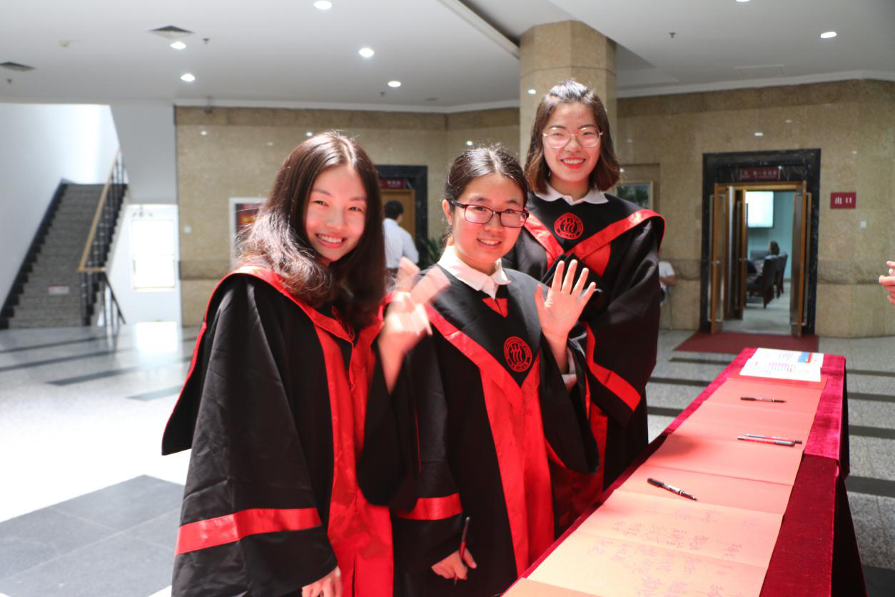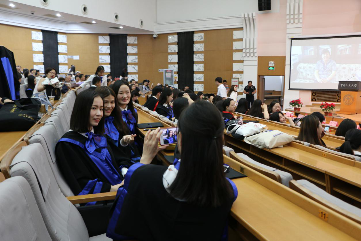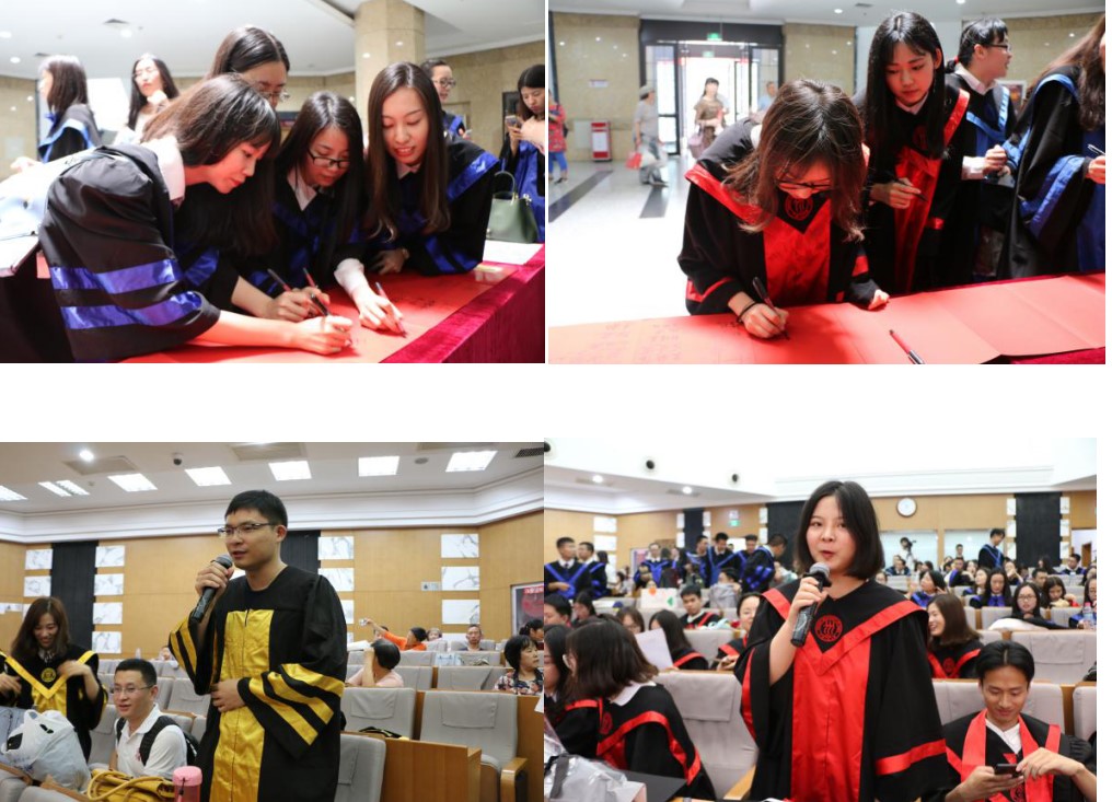 仪式前,毕业生们在签到簿上争相签名留念,写下毕业感言。场内,大屏幕上循环播放的视频,让全体师生和亲朋好友共同回顾了毕业生在人大学习、生活的美好时光。同学们难掩激动之情,纷纷拿起话筒倾述对学院和母校的留恋和不舍之情,表达对师友的感恩和祝福,现场气氛热烈。