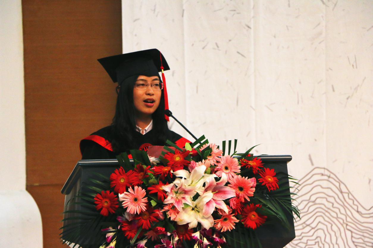 2018届本科毕业生朱叶作为毕业生代表发言。她回忆了自己四年间在学习科研、学生工作和社会实践中所取得的灵感与收获,表达了对母校、老师和家长的感激之情。在发言中,她通过在日常学习和生活中的亲身体验,感慨学校和学院近年来所发生的与时俱进的变化。作为人大毕业生,她表示会永远牢记母校嘱托,实事求是,始终奋进在时代前列,保持终身学习的习惯,积极迎接未来的机遇与挑战,争做“国民表率,社会栋梁”。