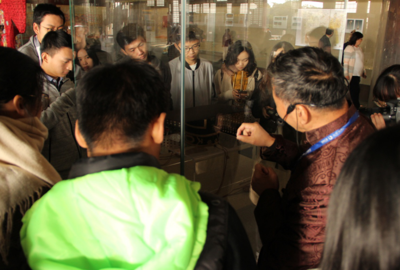 师生们随后进入长陵主殿祾恩殿。作为皇帝祭祀活动的主要场所,祾恩殿面阔九间,规制宏阔,木构件全系名贵的金丝楠木加工而成,堪称古建瑰宝。胡老师为大家详细讲述了皇帝祭祀的时间和礼仪等问题,并特别介绍,祾恩殿内珍贵的金丝楠木建筑材料是从四川湖北交界处采伐而来,牺牲了很多人。胡老师指出,殿内原有彩画已被剥落,仅剩下大殿顶上的彩绘可供观摩。随后胡老师带领同学们参观殿内正在进行的“定陵出土文物精品展览”。胡老师依次为大家讲解了帝冕、金丝翼善冠、三龙二凤冠、帝后服饰等文物。同学们在殿内仔细观察着大殿的木构特色和文物展品时,为建筑之恢宏、文物之精美所折服。