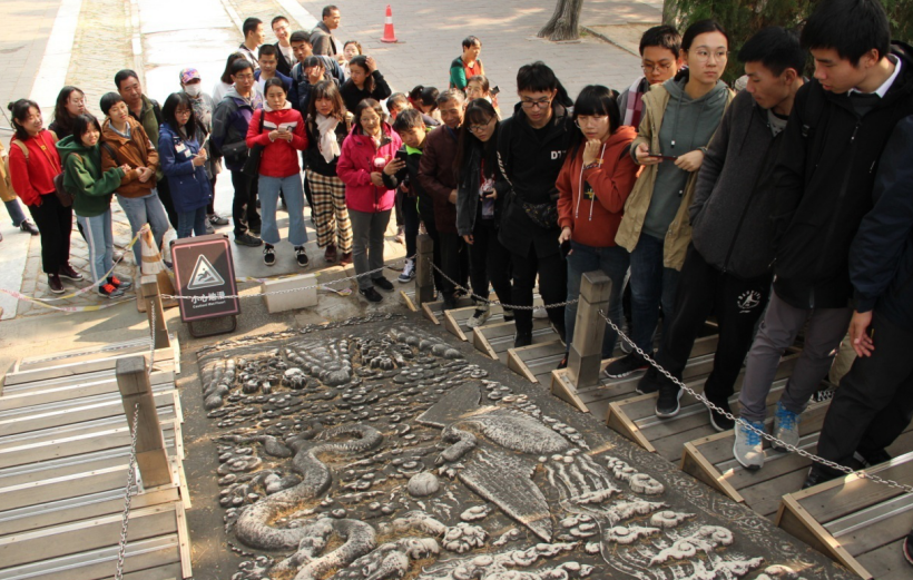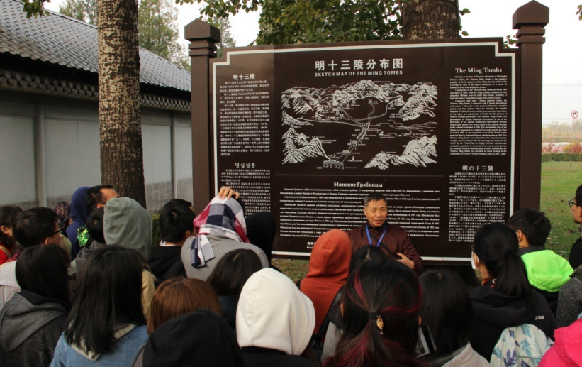 在本次考察中,胡老师除了结合实物讲解神道、长陵、定陵的的具体情况,还结合分布图或眼前的自然景象,为大家介绍了古代帝陵选址的风水、丧葬礼仪制度、古建筑特点等知识,同学们纷纷表示获益匪浅。